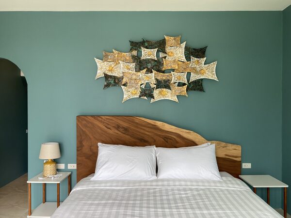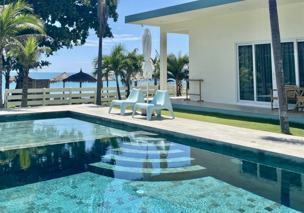 A boutique resort with elegant rooms, an oceanfront pool, and a private beach area with views of the green hills and the Gulf of Thailand.